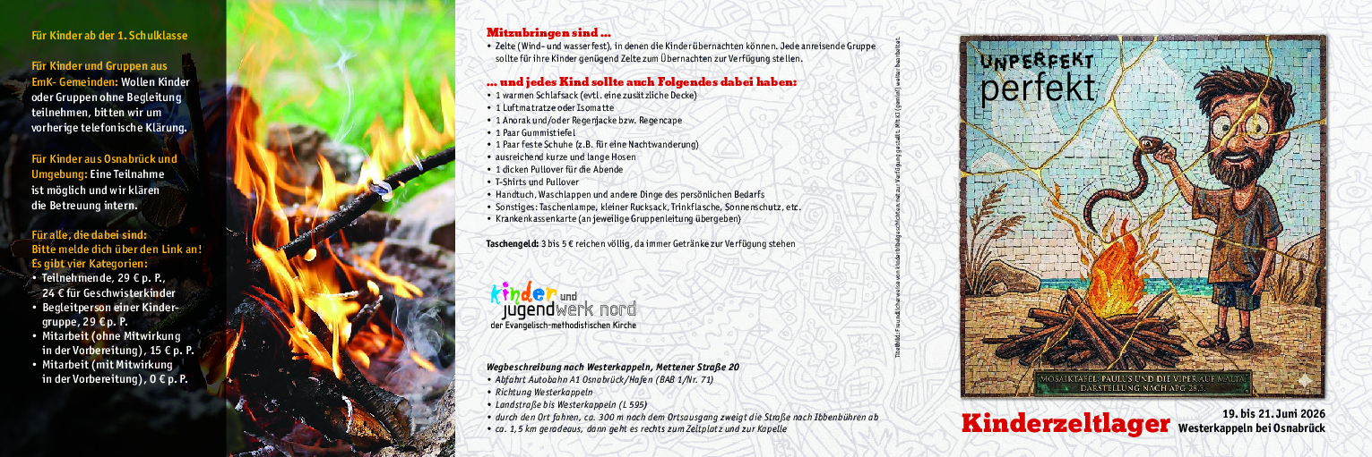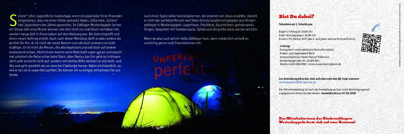 „Schere“ rufen Jugendliche heutzutage, wenn sie gegenüber ihren Freunden eingestehen, dass sie einen Fehler gemacht haben. 2024 wäre „Schere“ fast Jugendwort des Jahres geworden. Im Zeltlager Westerkappeln lernen wir dieses Jahr eine Person kennen, die sich nicht nur mal falsch verhalten hat, sondern lange Zeit in ihrem Leben auf dem Holzweg war. Bis Gott eingreift und einen neuen Auftrag erteilt. Auch nach dieser Wendung läuft es alles andere als perfekt für ihn. Er ist nicht der beste Redner und soll doch anderen von Gott erzählen. Er ist nicht die Person, die alle begeistert und soll doch auf andere ansteckend wirken. Nicht immer kommt seine Botschaft super gut an und manchmal scheitert die Reise schon beim Start. Aber Paulus (um ihn geht es in diesem Jahr) gibt so leicht nicht auf, sondern mit Gottes Hilfe meistert er alle Aufs- und Abs und geht gestärkt aus so mancher Challenge hervor. Dabei wird deutlich, so wie er ist, ist er unperfekt perfekt. Da können wir so einiges mitnehmen für uns heute.